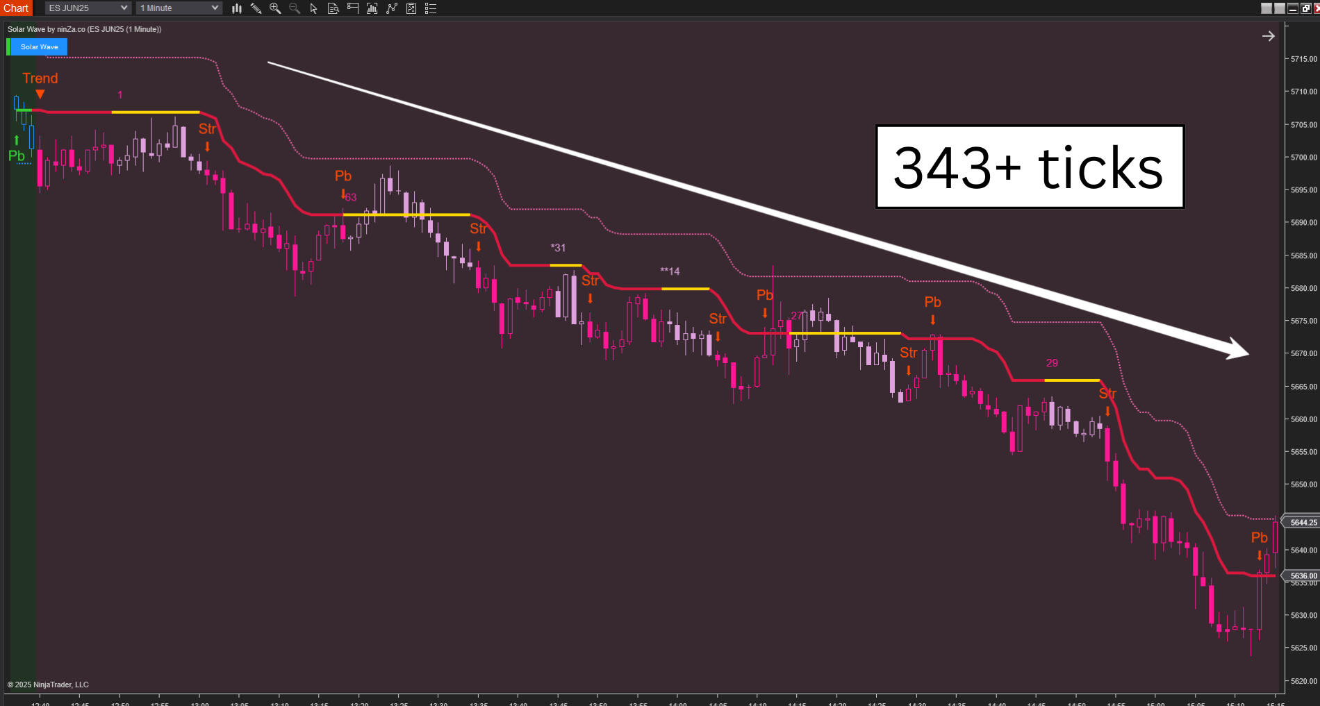 There’s a secret to trading Solar Wave...Solar Wave’s best signal is the PULLBACK entry, mostly the very 1st pullback entry after the market enters a new trend. You know, when the market takes a temporary breath and pulls back before continuing… That’s the perfect time to join the train.Solar Wave is there… simply to help you get in, without having to risk chasing the trend.Trend following has been simplified to the maximum… Because all you do is let Solar Wave check the trend for you… and then you locate the best pullbacks to enter with.If the “Trend Vector” plot is flat, the trend is weak: maybe it’s experiencing a correction, or it has matured with an imminent reversal.If the “Trend Vector” plot heads upward, the uptrend is strong. If the “Trend Vector” plot heads downward, the downtrend is strong.Just that simple!When you see the Trend Vector plot like this in the E-Mini S&P 500 (ES)… You get ready to enter with the trailing stop attached… and take a ride for 343+ ticks.